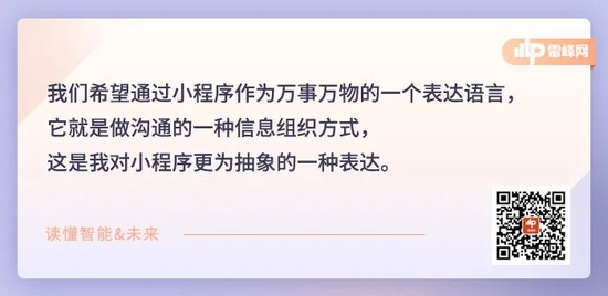 小程序最终的目的不光是在线上可以玩一个游戏或者获取一个服务的信息,对于线下,对更多的一个场景它就代表了我们所能接触到的,所能见到的任何事物它背后的信息以及对于它背后信息访问的方式。所以我们希望通过小程序作为万事万物的一个表达语言,它就是做沟通的一种信息组织方式,这是我对小程序更为抽象的一种表达。