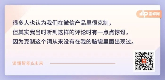 很多人也认为我们在微信产品里很克制,但其实我当时听到这样的评论时有一点点惊讶,因为克制这个词从来没有在我的脑袋里面出现过。