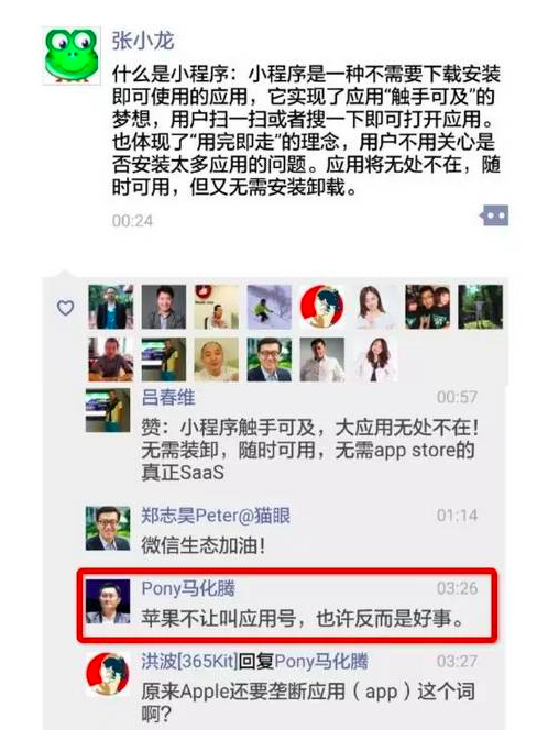 不过,张小龙也强调,小程序并非是从开发人员的角度来说要改变一下应用程序的存在模式,而是基于特定的需求;他在后面的演讲中用PC互联网的网站服务作对比,认为小程序其实可以想象成“PC时代的一个网站”。