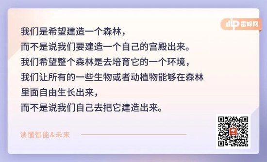 我们是希望建造一个森林,而不是说我们要建造一个自己的宫殿出来。我们希望整个森林是去培育它的一个环境,我们让所有的一些生物或者动植物能够在森林里面自由生长出来,而不是说我们自己去把它建造出来。