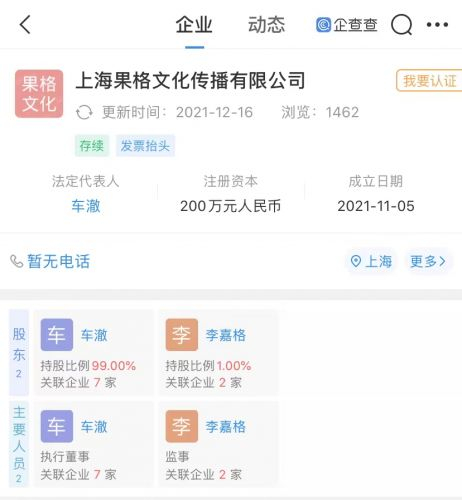 上海果格文化传播有限公司,成立于2021年11月,车澈为该公司法定代表人及大股东。该公司在社交平台认证名称为“INDEcompany”,简介为 一个建筑幻觉的创意单位。