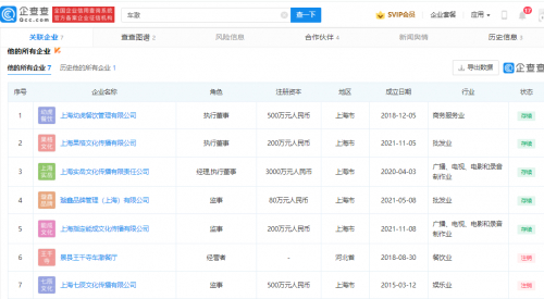 企查查APP显示,车澈共关联7家企业(2家已注销),包含上海幼虎餐饮管理有限公司、上海实岳文化传播有限责任公司、上海果格文化传播有限公司等。