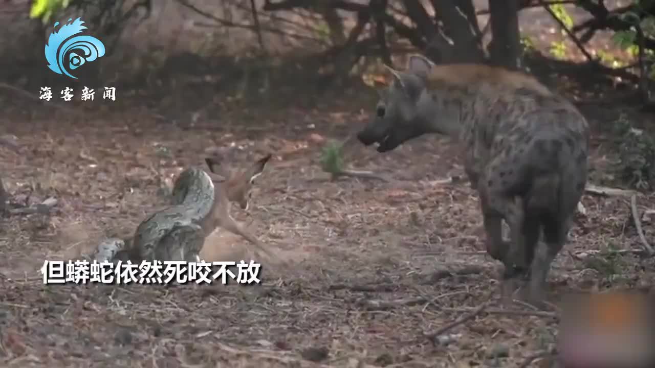 鬣狗追杀羚羊被蟒蛇捷足先登 干脆连蛇一起叼走 下秒被蛇吓一跳