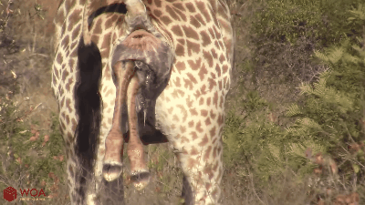 陆地上最高的哺乳动物长颈鹿站着分娩,长颈鹿宝宝像是要爬出来,前腿和脑袋先出来,出来后小宝宝将从妈妈两米高的屁股往下掉落——这能让羊膜囊破裂,帮助长颈鹿宝宝呼吸。孩子长大后,会去妈妈原来生娃的地方生娃。