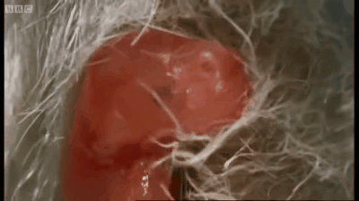 袋鼠刚出生的时候,小得就像一颗小豆子。这颗红红的小豆子,完全凭借着本能和自己的努力,抓着妈妈身上上的毛发,奋力爬进育儿袋里找奶喝。