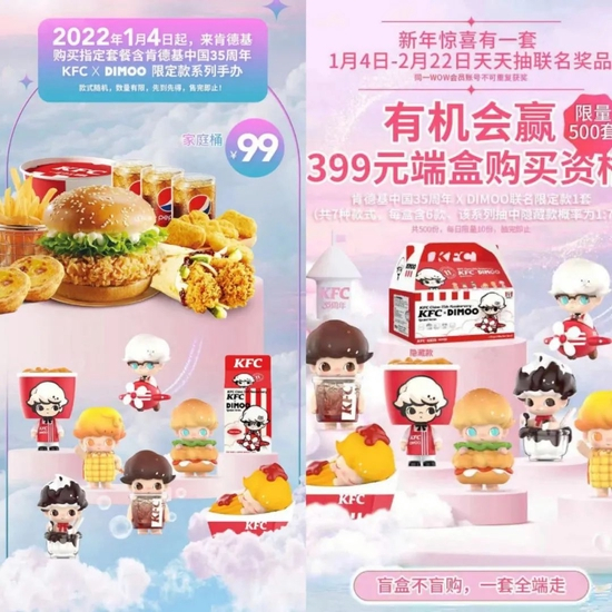 搭上快餐品牌肯德基,泡泡玛特从1月4日起推出联名套餐,仿佛开启了新的流量密码。一个普通的肯德基套餐,加上泡泡玛特的盲盒,让“肯德基 dimoo”的话题迅速登上热搜。