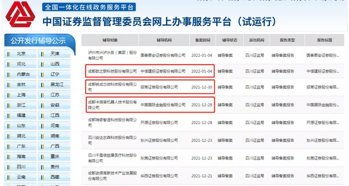 天虎科技观察,1月11日,据中国证监会网上办事服务平台公示,最近两周以来,数之联、锐成芯微、卡诺普等成都多家明星科技企业的上市辅导备案已获受理。这也意味着企业进入了常说的上市辅导期,期间由券商对企业进行上市辅导,主要目的是让企业建立起完全符合上市要求、相对完善的运营体制。