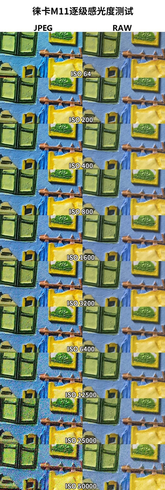 从实际拍摄的感光度测试来看,徕卡M11的JPEG照片在ISO 3200时有轻微的噪点,但并不严重,而RAW在同样的感光度下依旧十分纯净。猜测JPEG照片开始出现轻微噪点的原因也许跟徕卡M11的高像素以及机身处理有关。到ISO 6400时,徕卡M11拍摄的RAW格式开始出现轻微的画质下降,但总体表现依然不错。到ISO 12000时,可以看到JPEG和RAW都有噪点,但RAW格式图片要好于JPEG,之后随着感光度的提升,噪点愈加明显,到ISO 50000时不论是RAW还是JPEG噪点都十分明细,但照片并未到不可用的地步。