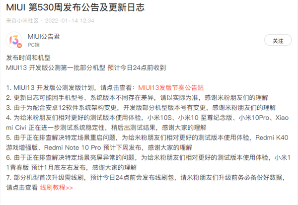 今天,小米官方在社区发文称,MIUI13开发版公测第一批部分机型预计今日24点前收到,将有二十多款可同时升级至MIUI 13。