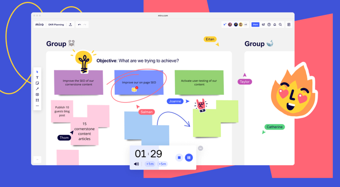 Miro 还具有音频和视频连接功能,可让用户在一起工作或展示板时与合作者通话。有一个屏幕共享选项、一个计时器和一些其他工具。如果用户没有选择 Miro 作为视频会议工具,他们还可以随时将其连接到 Zoom 或 Microsoft Teams 中。