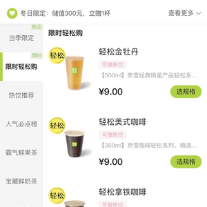 近日,在奈雪的茶点单小程序上,《财经天下》周刊发现,多款茶饮产品出现了大幅降价。奈雪的茶推出了“限时轻松购”系列产品,茶饮价格从9元到21元不等。其中,产品价格最低的茶饮和咖啡,例如轻松金牡丹、轻松美式咖啡、轻松拿铁咖啡等产品,售价都仅为9元。与奈雪的茶常规情况下单品30元左右的售价相比,显然低了不少。