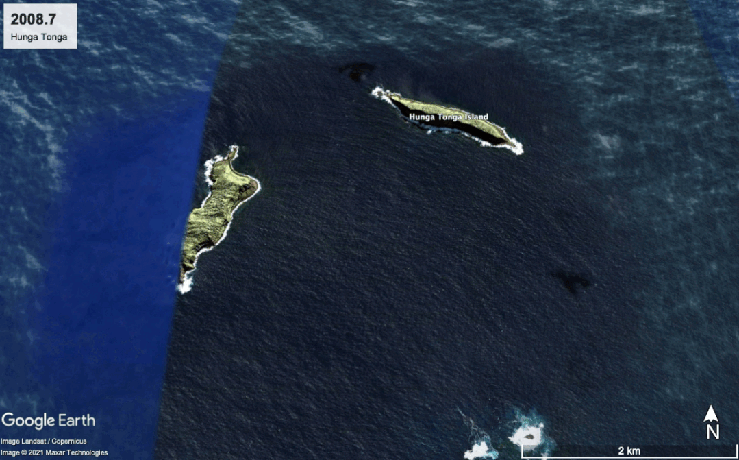根据Google earth pro的卫星图像,汤加火山的形态在过去十年内仍然在随着喷发的进行而发生变化,尤其是2015年喷发以后,在前文提到的两岛中间出现了一个新的火山锥,应该也是本次喷发喷出的地方。