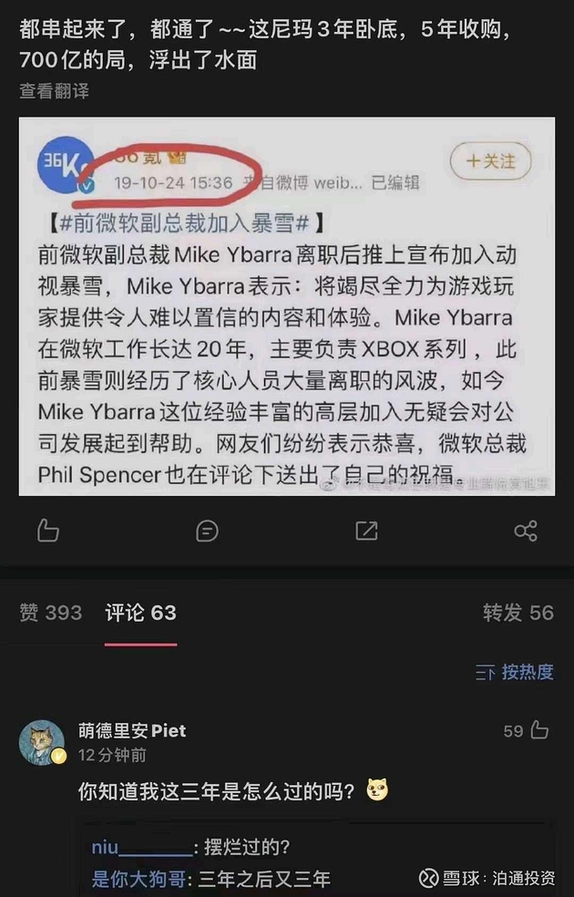 一个有趣的插曲是,微软副总裁Mike Ybarra 两年多前跳槽至动视暴雪,此次收购传出后,Mike Ybarra被网友调侃为神“卧底”。