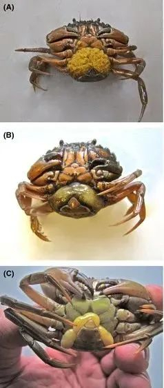 正常的和被寄生的普通滨蟹Carcinus maenas。从上到下:正常的携带幼体普通滨蟹,被蟹奴S。 carcini寄生的雌性普通滨蟹,被蟹奴寄生的雄性普通滨蟹。不论性别,被寄生的螃蟹都表现出抱卵的姿态 | David Rees & Henrik Glenne / Ecology and Evolution (2014)