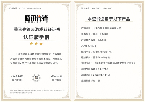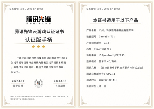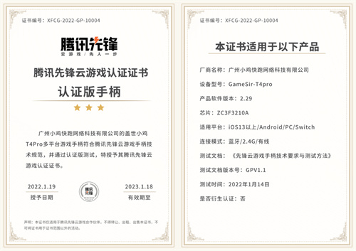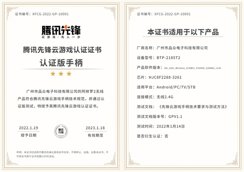 可以在智能TV大屏等多端设备稳定兼容腾讯先锋云游戏,在云游戏最为看重的“操作延迟”方面能够满足苛刻的认证标准,使用寿命、人体工学等方面均有独到之处;本次获得“3星认证”的产品有北通、小鸡、飞智等多款大热产品。