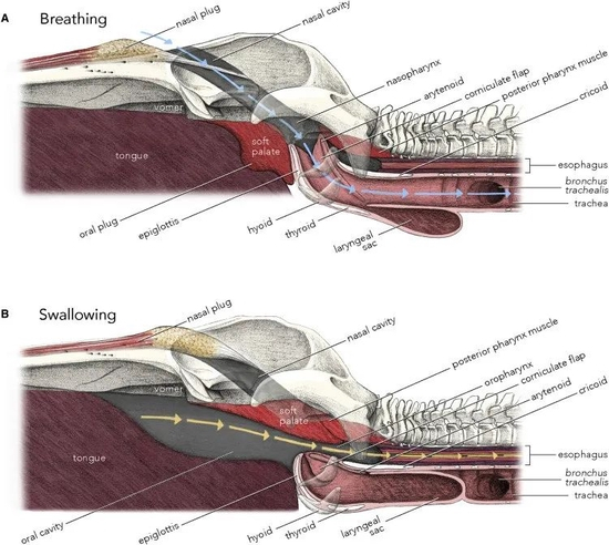 该论文第一作者、来自加拿大不列颠哥伦比亚大学(University of British Columbia)的Kelsey Gil博士解释道,这有点像当人类进食时,悬雍垂(uvula,俗称“小舌”,悬挂于口腔内软腭处)会向上收缩,堵住食物从鼻腔进入气管的通道;我们的气管在吞咽食物时也会通过会厌(咽喉中舌头下方的组织瓣)关闭,让食物乖乖进入食道,避免我们被呛到。
