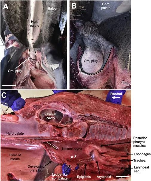 原来,须鲸类鲸鱼的口腔内有一个独特的“口塞(oral plug)”结构,能够防止水进入肺部。这是一颗肌肉和脂肪组成的球状物,属于软腭的一部分。在进食过程中,“口塞”移动封闭住上呼吸道,喉部则会闭合关上下呼吸道。