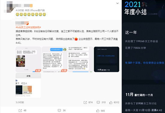 该网友还分享了逝者2021年的年度小结,其中显示,年内逝者共处理了199240次工作会话,花费了73024分钟,有321个深夜在使用企业微信。最忙碌的11月,共参与了21930次工作讨论,最晚一天是11月12日凌晨4:42。