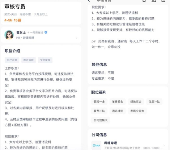 即使是在招聘网站中,B站有关审核专员岗位的职位要求中也详细注明:此岗有夜班、通宵班,每天工作12个小时,做一休一。