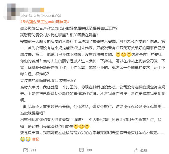 雷达财经注意到,事发后,微博上有自称逝者表妹的人发声质问B站,称其并未对家属进行安抚和善后工作。其称,逝者于初五下午下葬,家属打电话通知公司人事主管,公司方面并没有人前来慰问。事发后,B站方面也未协商过。