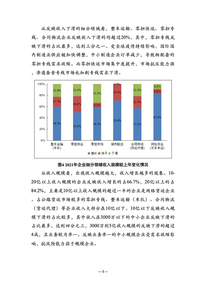 从收入规模看,出现收入规模越大,收入增长越多的现象。10-20亿以上收入规模的企业反映收入增长的占66.7%,20亿以上的占84.2%,主要是10亿以上收入规模的超过一半的企业是网络货运企业。占公路货运市场较多的零担专线、整车运输(车队)、合同物流(货运代理)等企业收入大部分在10亿以下。10亿以下反映收入规模下滑的占比较多,其中收入在3000万以下的中小企业反映下滑的占比最多,达到四分之三,3000万到5亿收入规模的反映下滑的超过4成,且业务较为单一。反映业务单一的中小规模企业受需求收缩影响,抗风险能力弱于规模企业。