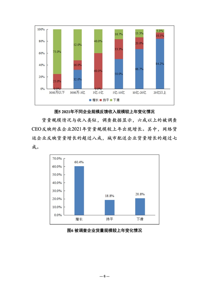 货量规模情况与收入类似,调查数据显示,六成以上的被调查CEO反映所在企业2021年货量规模较上年出现增长。其中,网络货运企业反映货量增长的超过八成,城市配送企业货量增长的超过七成。