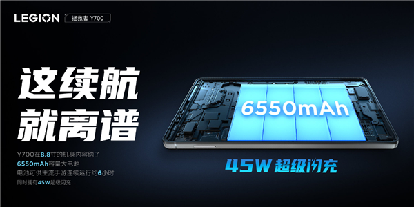 据了解,联想拯救者Y700游戏平板内置6550mAh超大电池,可供主流游戏连续运行约6小时,同时配备45W超级闪充,官方表示:“这续航,就离谱。”