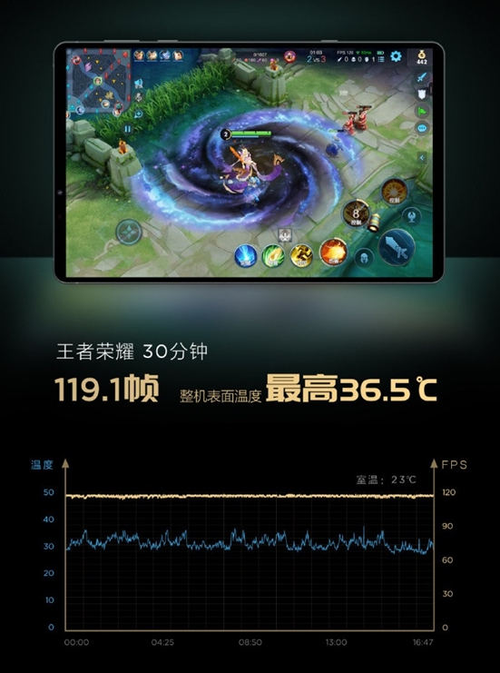 根据官方游戏实测数据,在《王者荣耀》120高帧率的测试中,拯救者Y700全程稳定在119.1fps,帧率几乎稳成一条直线,但机身表面温度最高只有36.5℃(室温23℃)。
