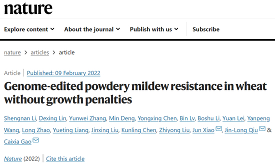 [1] Shengnan Li et al。, Genome-edited powdery mildew resistance in wheat without growth penalties。 Nature (2022) https://doi.org/10.1038/s41586-022-04395-9
