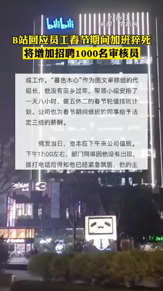 B站再次回应员工春节猝死:B站向猝死员工的家属致歉,审核人员将扩招1000人