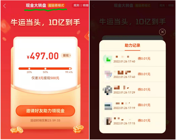 新浪科技测试发现,在现金大转盘活动下,要完成一笔500元的提现,需要凑够3元,邀请好友助力,一般每个人头只能助力0.01元。这意味着至少要邀请300个人来助力才能完成这笔现金提现。