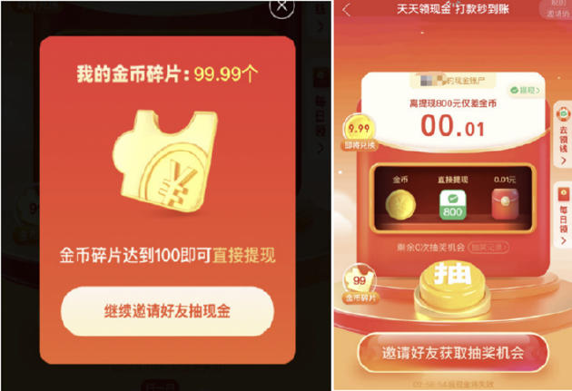 就这样,进度条永远差0.9%,在一环扣一环的套路下,很多人在邀请数十、上百位好友助力、下载、注册拼多多App后,都没法很轻松完成最后的提现。他们看着App页面上“金灿灿”的499.99元,999.99金币,99.9幸运值等字样,无奈、气愤、崩溃又不愿放弃。