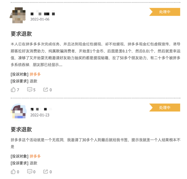 近日来,社交媒体上针对拼多多现金提现的骂声一片,在黑猫投诉上,更有大量针对拼多多现金提现活动的投诉。不少网友认为,拼多多此类活动涉嫌欺骗消费者、虚假宣传等。