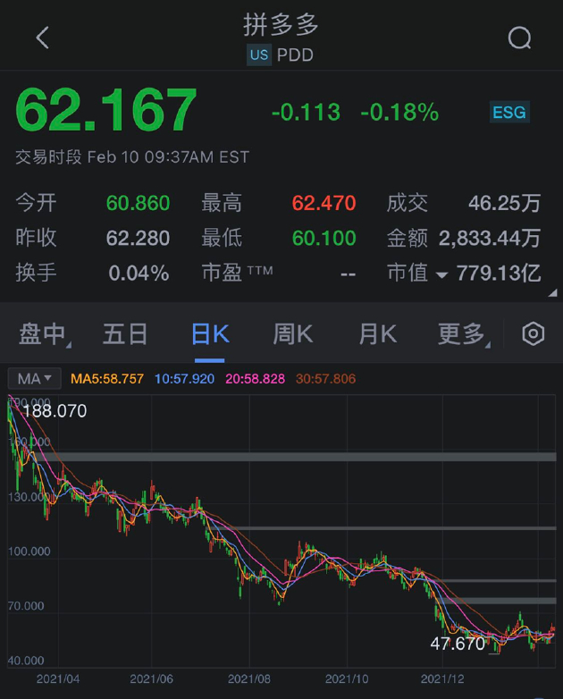 此外,过去一年,拼多多市值一再缩水。2021年2月最高的时候,一度突破2600亿美元,但是一年后,拼多多总市值已经在700亿美元左右浮动。此前更是跌到600亿美元左右。目前,截至周三收盘,拼多多最新市值为753.98亿美元。