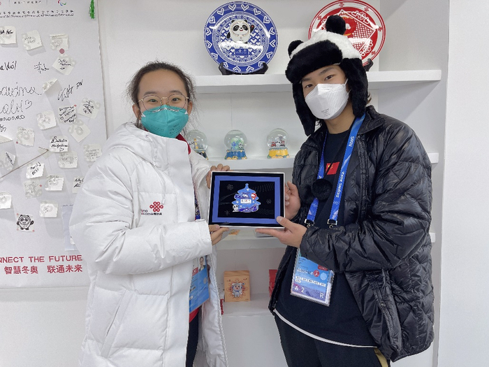 ——中国女子冰球队孙锐教练、运动员刘智新手捧中国联通原创的冬奥周边,和北京冬奥村中国联通展示厅的宋姣合影留念。
