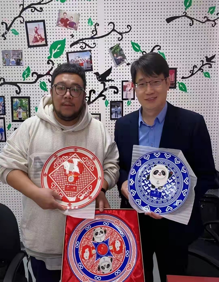 被巴赫先生、小萨马兰奇先生和伊阿尼斯·埃克萨科斯先生捧在手上的冰墩墩、雪容融冬奥看盘,出自北京联通客服中心员工许鹏之手(下图左一)。他介绍道,“很幸运我的青花瓷盘子冬奥设计作品被选为特殊的纪念品赠与国内外友人。之所以选择青花瓷,是因为首先瓷器在英语的发音本身就和中国一样;其次是青花瓷以白蓝为主,符合冬奥气息;再次是中国联通的LOGO中国结又是一种传统的中国纹饰演变而来,寓意吉祥如意。这样我就把这些元素结合,凝聚成盘,期待全世界运动健儿相聚北京、圆梦北京。看到名人与我的作品合影,感觉非常开心和自豪,感觉我在另外的赛场为北京冬奥会助力,为中国联通争光。”
