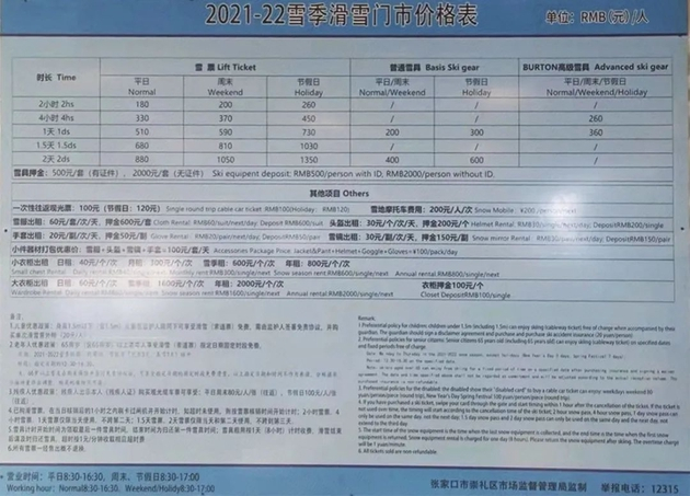 据此前消费者分享的图片显示,2020-2021雪季崇礼万龙滑雪场平日周末两天雪票价格约为680元,双龙酒店两天一晚的价格为1269元到2269元不等。按照这一价格对比,2021-2022雪季,崇礼万龙滑雪场的雪票价格上浮约54%,住宿价格上浮约44%。