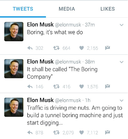 堵车快给我整疯了,我要造一个盾构机开始挖洞了——马斯克,2016 | Twitter