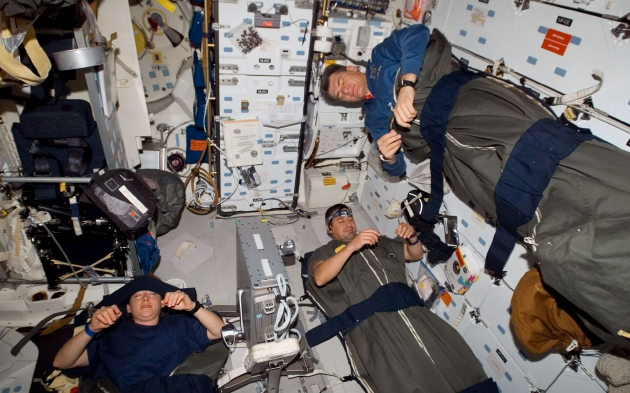 图2:图为宇航员卡拉·巴隆在国际空间站上参加完“睡衣派对”后,在哥伦布实验舱中休息。