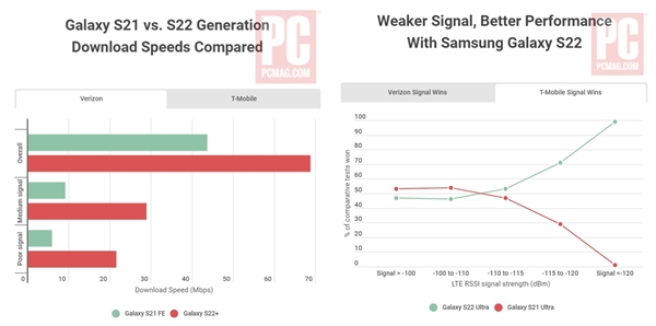 2月15日消息,PCMag测试了三星Galaxy S22+、Galaxy S22 Ultra两款高端旗舰的信号表现,对比机型分别是Galaxy S21 FE和Galaxy S21 Ultra。