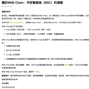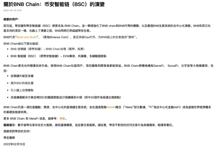 公告称,更名强化了公链和BNB代币的关联;并表示,BNB的使用已超越币安生态,更名强化整个BNB生态系统的去中心化演变。