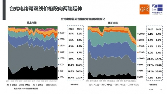 相比之下,台式电烤箱双线市场价格段向两端延伸态势明显,200元以下和2000元以上产品双线市场的零售额份额增长明显。从容积规格看,30L以下台式电烤箱占比提升,20-30L产品线上市场占比由2020年的6.7%提升至2021年的8.5%,线下市场占比由12.4%提升至15.4%。
