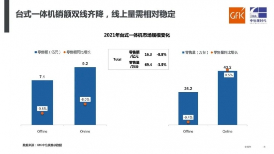 据GfK中怡康推总数据,2021年台式一体机销额双线齐降,零售额16.3亿元,同比下降8.8%;零售量69.4万台,同比下降3.5%。线上量需相对稳定,2021年线上市场零售量同比微增0.5%。