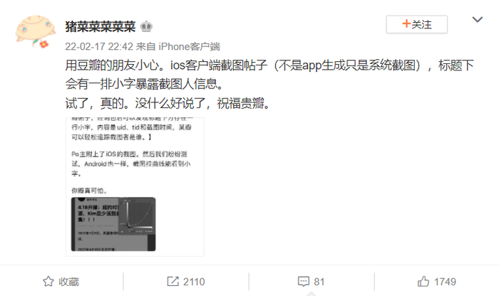 IT之家2月20日消息,据蓝点网报道,不少社交用户报告称,豆瓣应用在页面中嵌入了难以察觉的水印,如果用户已经登录账号则在截图时就可能会包含用户账号。