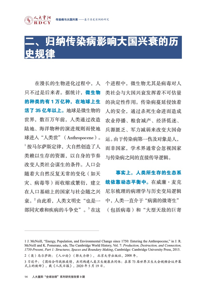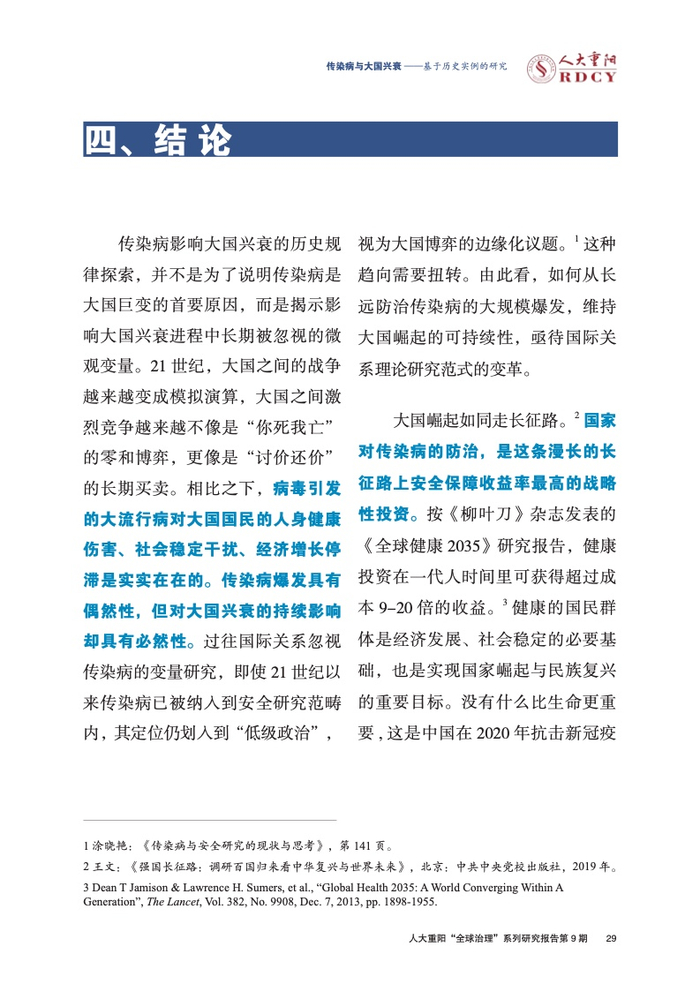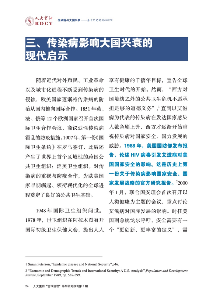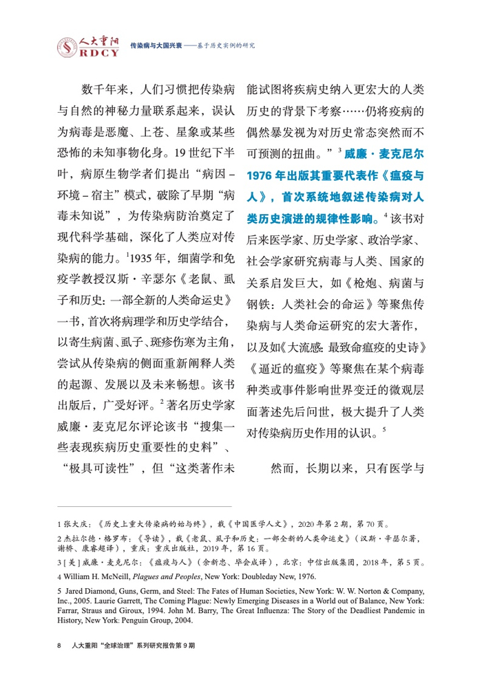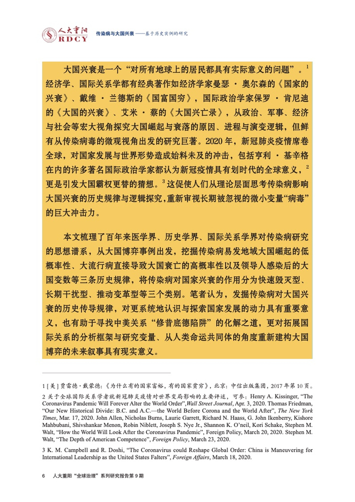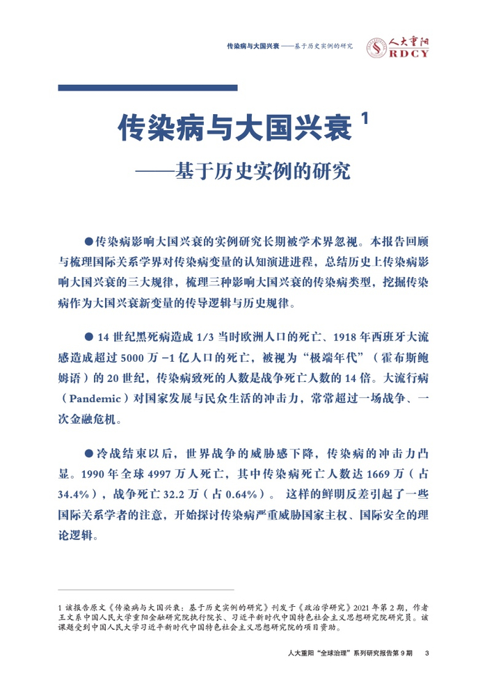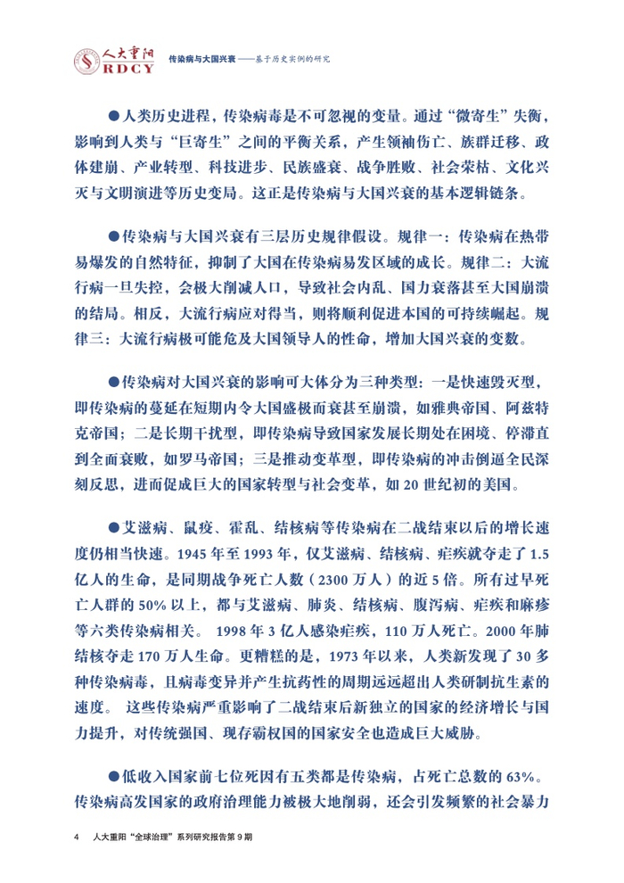 ●传染病影响大国兴衰的实例研究长期被学术界忽视。本报告回顾与梳理国际关系学界对传染病变量的认知演进进程,总结历史上传染病影响大国兴衰的三大规律,梳理三种影响大国兴衰的传染病类型,挖掘传染病作为大国兴衰新变量的传导逻辑与历史规律。