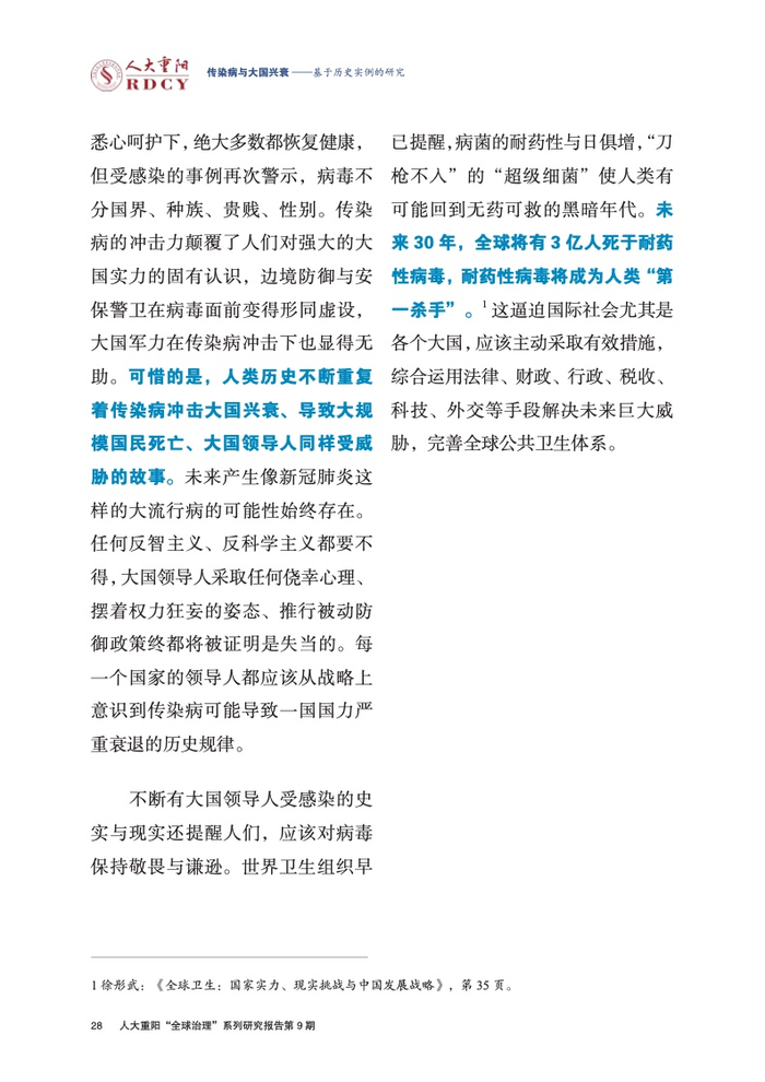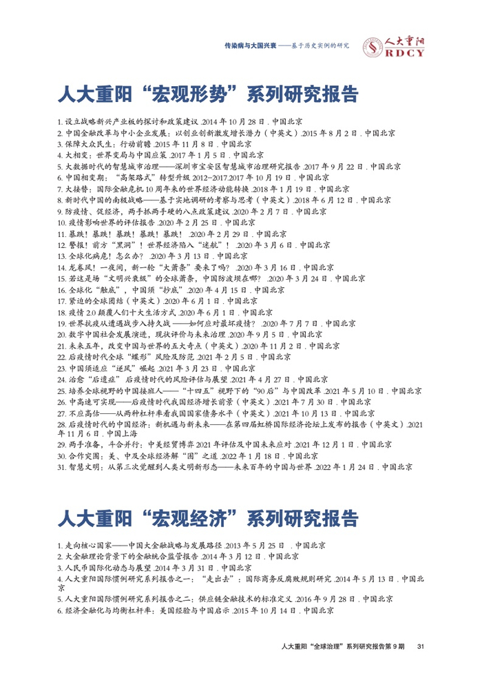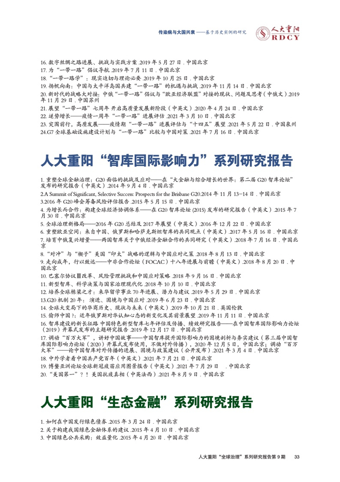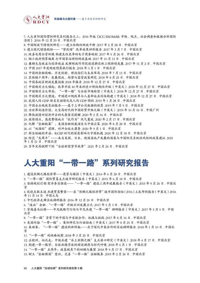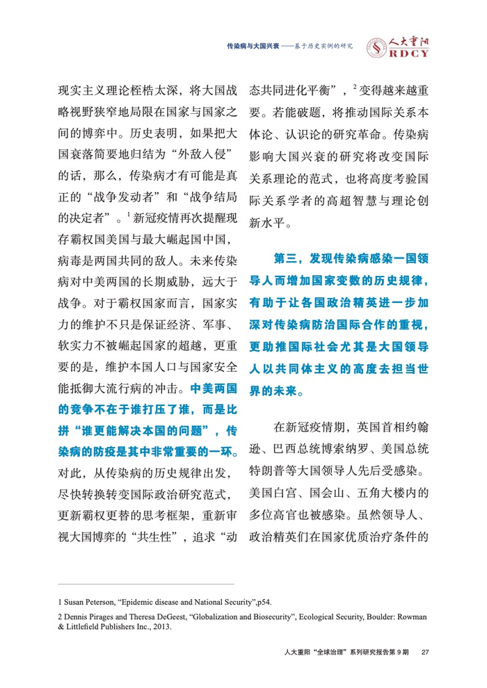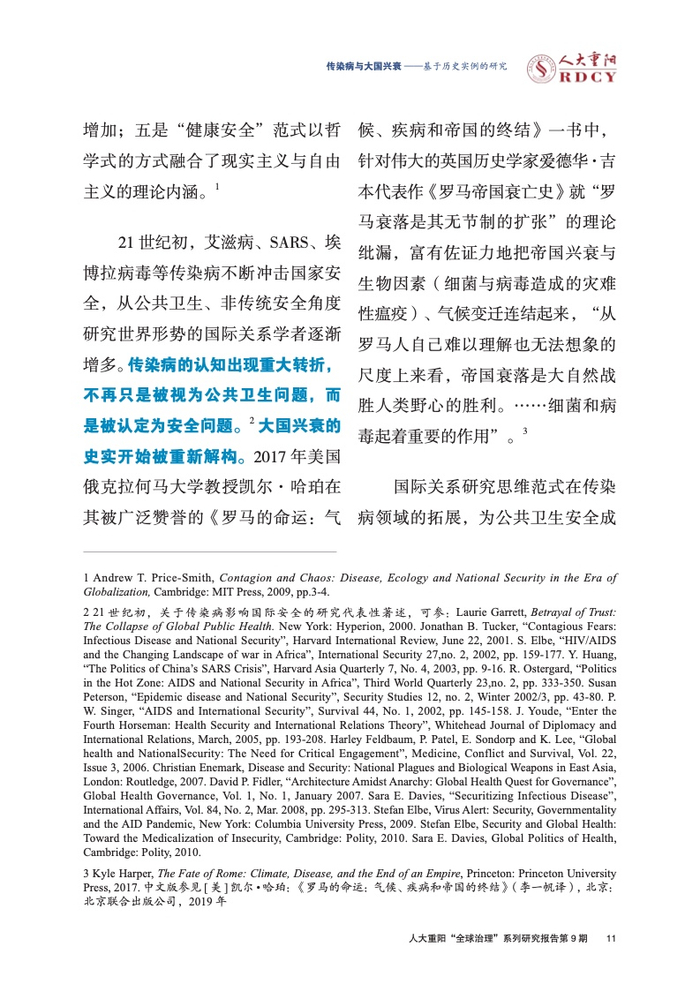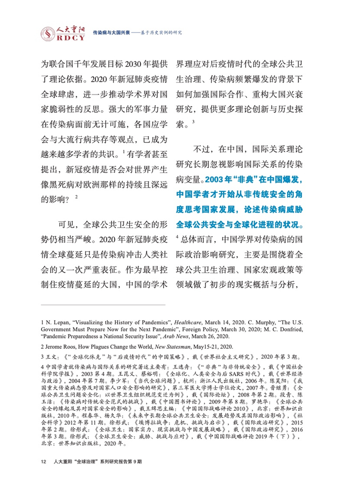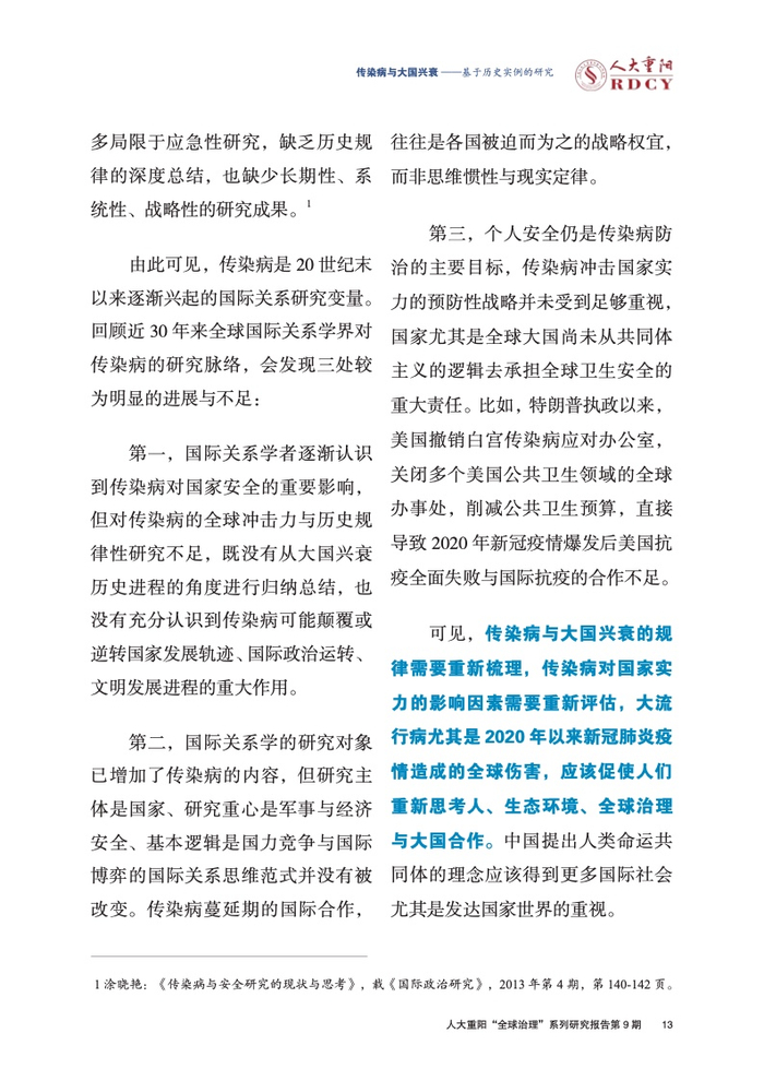 ●传染病影响大国兴衰的实例研究长期被学术界忽视。本报告回顾与梳理国际关系学界对传染病变量的认知演进进程,总结历史上传染病影响大国兴衰的三大规律,梳理三种影响大国兴衰的传染病类型,挖掘传染病作为大国兴衰新变量的传导逻辑与历史规律。
