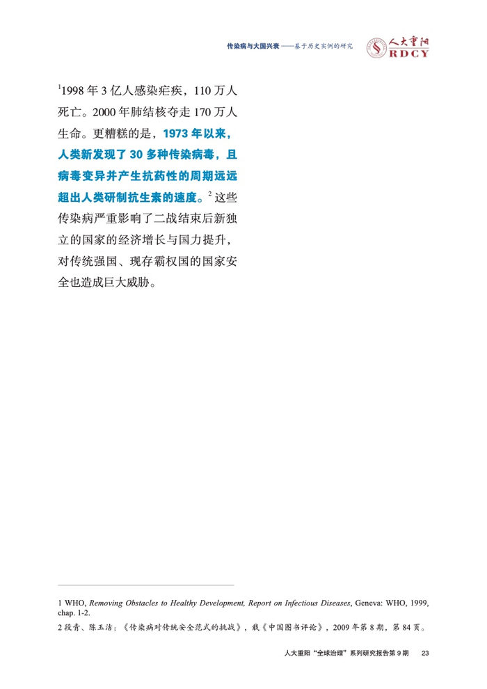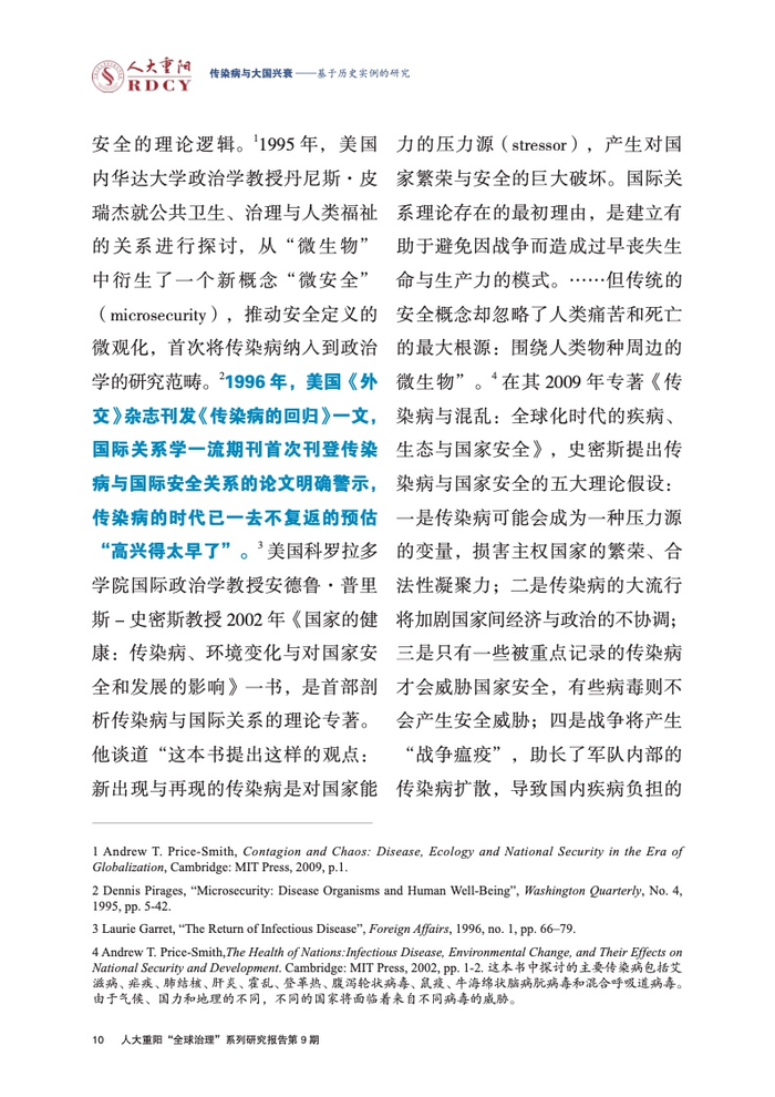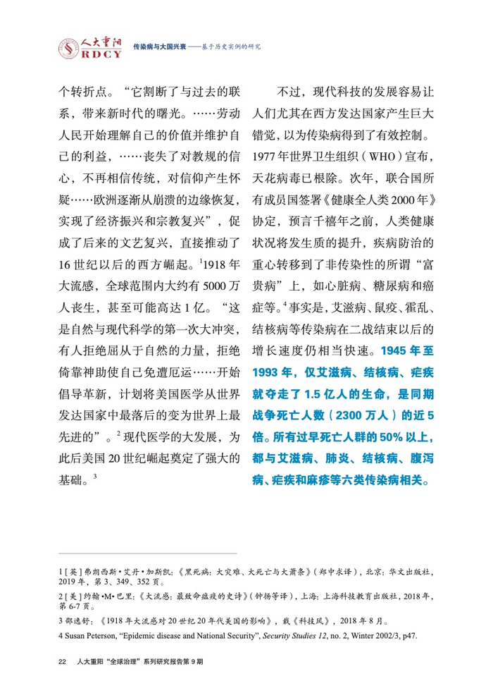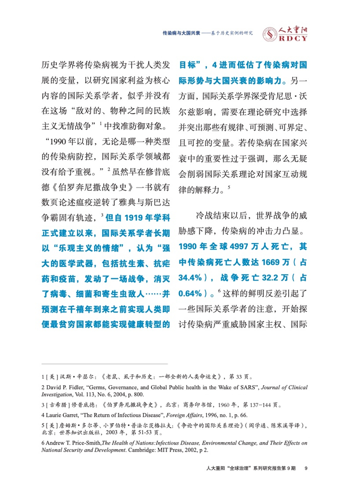 ●冷战结束以后,世界战争的威胁感下降,传染病的冲击力凸显。1990年全球4997万人死亡,其中传染病死亡人数达1669万(占34.4%),战争死亡32.2万(占0.64%)。 这样的鲜明反差引起了一些国际关系学者的注意,开始探讨传染病严重威胁国家主权、国际安全的理论逻辑。