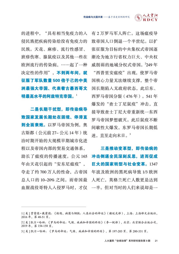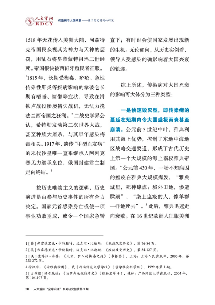 ●传染病对大国兴衰的影响可大体分为三种类型:一是快速毁灭型,即传染病的蔓延在短期内令大国盛极而衰甚至崩溃,如雅典帝国、阿兹特克帝国;二是长期干扰型,即传染病导致国家发展长期处在困境、停滞直到全面衰败,如罗马帝国;三是推动变革型,即传染病的冲击倒逼全民深刻反思,进而促成巨大的国家转型与社会变革,如20世纪初的美国。