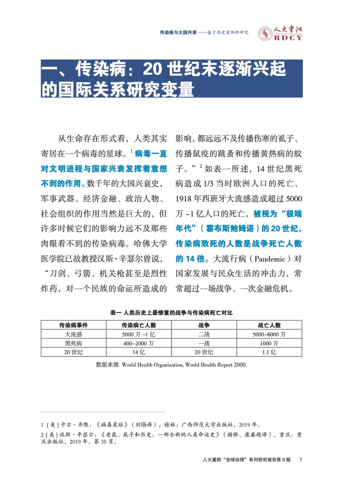 ●14世纪黑死病造成1/3当时欧洲人口的死亡、1918年西班牙大流感造成超过5000万-1亿人口的死亡,被视为“极端年代”(霍布斯鲍姆语)的20世纪,传染病致死的人数是战争死亡人数的14倍。大流行病(Pandemic)对国家发展与民众生活的冲击力,常常超过一场战争、一次金融危机。