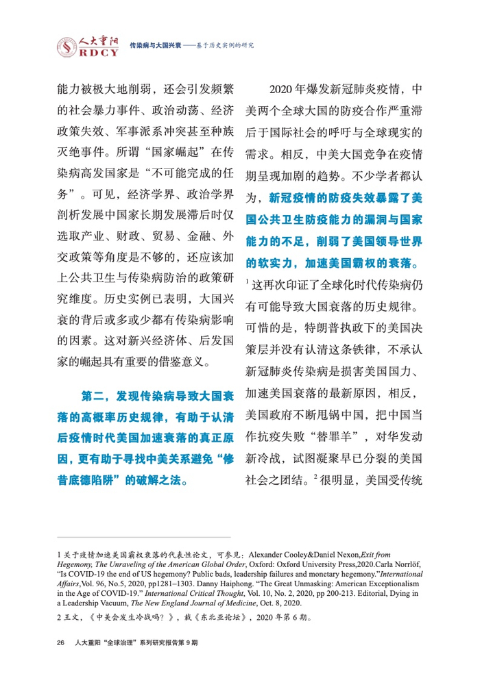 ●新冠疫情的防疫失效暴露了美国公共卫生防疫能力的漏洞与国家能力的不足,削弱了美国领导世界的软实力,加速美国霸权的衰落。 这再次印证了全球化时代传染病仍有可能导致大国衰落的历史规律。